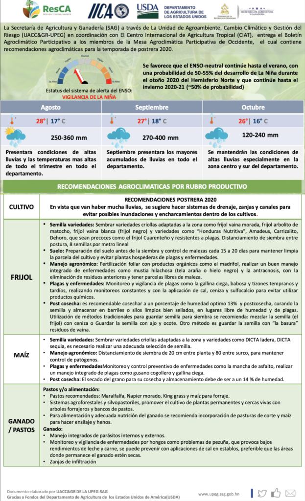 La Secretaría de Agricultura y Ganadería (SAG) a través de La Unidad de Agroambiente, Cambio Climático y Gestión del Riesgo (UACC&GR-UPEG) en coordinación con El Centro Internacional de Agricultura Tropical (CIAT), entrega el Boletín Agroclimático Participativo a los miembros de la Mesa Agroclimática Participativa de Occidente, el cual contiene recomendaciones agroclimáticas para la temporada de postrera 2020.